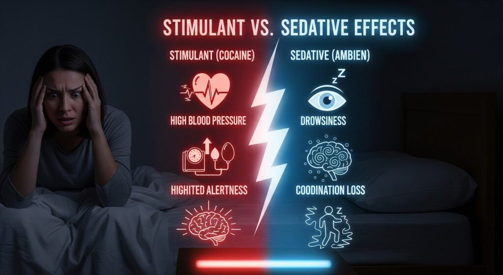One of the primary risks of mixing stimulants and sedatives is the masking effect. Cocaine can hide the feeling of sedation that Ambien normally causes.