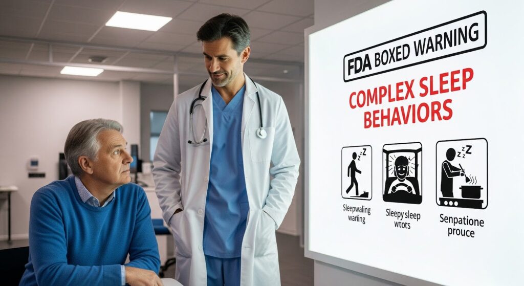 Zolpidem carries a serious warning regarding complex sleep behaviors. These are activities that people perform while they are not fully awake, such as sleep-walking, sleep-driving, preparing food, or making phone calls.