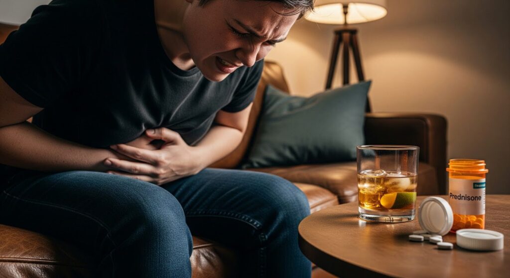 Prednisone irritates and thins the lining of your stomach and duodenum, creating vulnerability to ulceration and bleeding. Alcohol delivers direct mucosal injury and can worsen gastric acid secretion, adding a second hit to already compromised tissue.