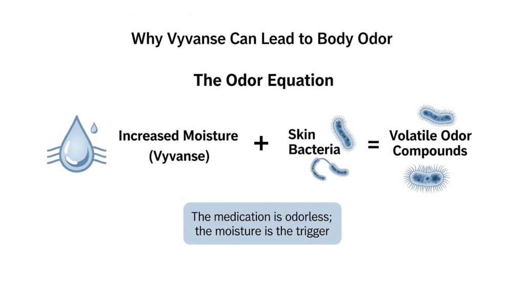 Body odor on Vyvanse is not caused by the medication directly changing your sweat chemistry. Instead, it results from increased moisture in the armpits creating a better environment for bacteria to break down sweat components into smelly compounds.