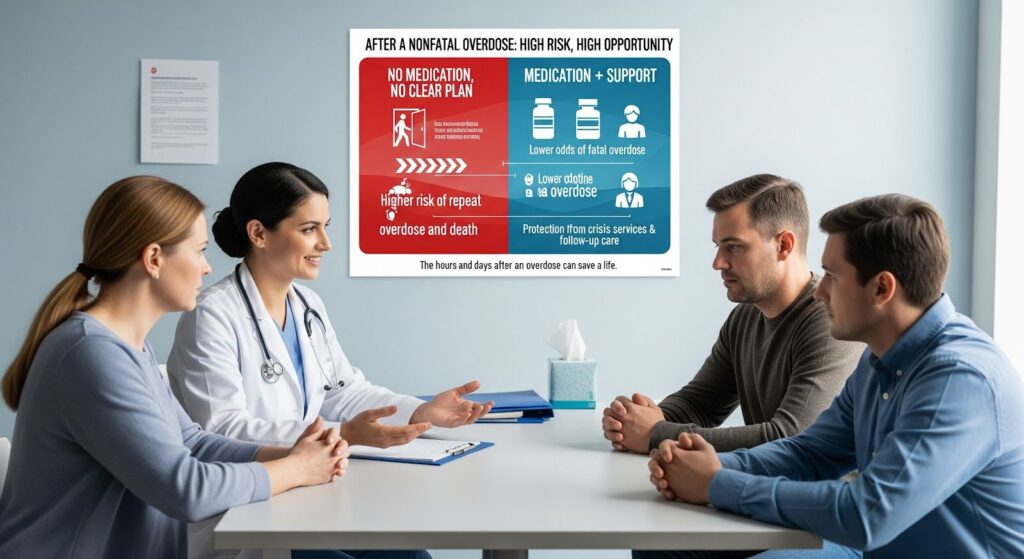 A national study of Medicare patients found that only 4.1% of overdose survivors received medication for opioid use disorder within 12 months, and 17.4% experienced another nonfatal overdose.