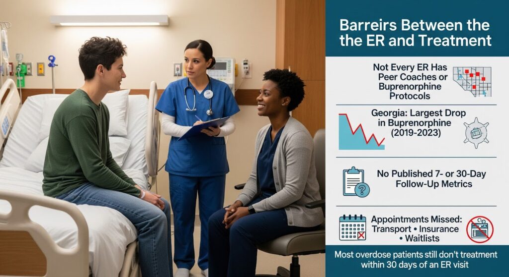 Despite these programs, most Atlanta overdose patients do not enter treatment within 30 days of an ER visit. Several factors explain the gap: