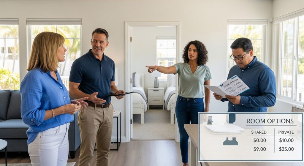 A shared bed costs $1,200 while a private room in the same house is $1,800, a clear 50 percent increase. This premium reflects lost bed revenue, higher vacancy risk, and consumer willingness to pay for privacy during recovery.