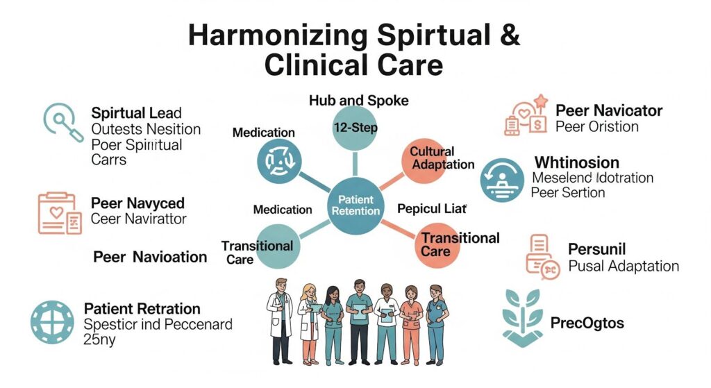 The optimal approach for enhancing retention and completion in short-term residential settings is an integrated model that combines spiritual engagement through on-site 12-step facilitation, medication for opioid use disorder, and structured transitional care. In long-term programs, the association between medication and completion is weaker or negative, so spiritual engagement may still offer engagement and psychosocial benefits, but program-specific design and measurement are crucial.